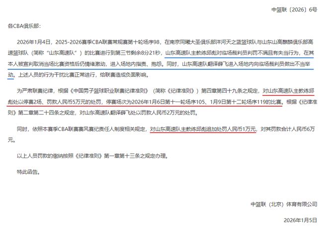 北京时间1月5日深夜,CBA公司突然发布公告,对山东男篮主教练邱彪和翻译薛飞开出罚单。原文写道:“对山东高速队主教练邱彪处以停赛2场、罚款人民币5万元的处罚,停赛场次为2026年1月6日第十一轮场序105、1月9日第十二轮场序119的比赛。”