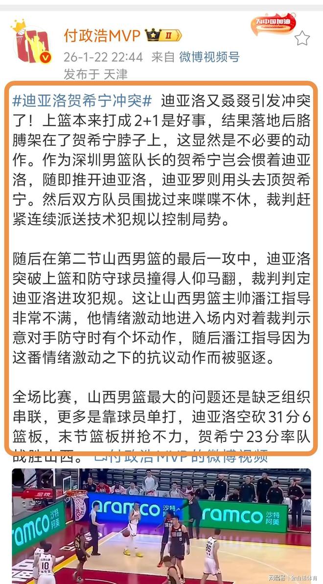 “随后在第二节山西男篮的最后一攻中,迪亚洛突破上篮和防守球员撞得人仰马翻,裁判判定迪亚洛进攻犯规。这让山西男篮主帅潘江指导非常不满,他情绪激动地进入场内对着裁判示意对手防守时有个坏动作,随后潘江指导因为这番情绪激动之下的抗议动作而被驱逐。”。