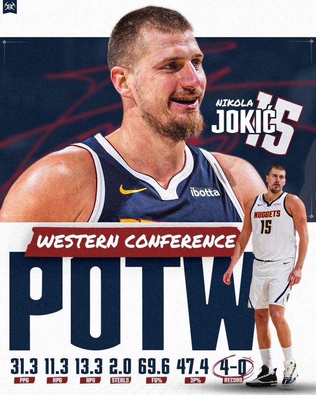 过去这一周,30岁的约基奇场均贡献31.3分、11.3个篮板、13.3次助攻和2.0次抢断,投篮命中率达69.6%,三分命中率为47.4%,带领掘金队取得了4胜0负的不败战绩。