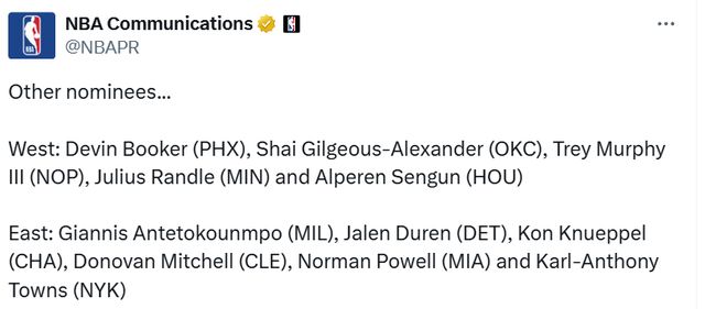 西部:布克(太阳)、亚历山大(雷霆)、墨菲(鹈鹕)、兰德尔(森林狼)、申京(火箭)