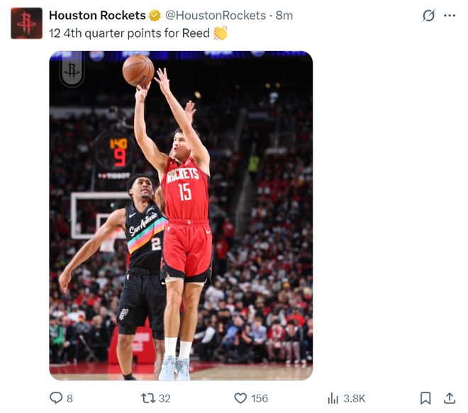 北京时间1月21日,NBA常规赛,火箭111-106逆转马刺拿到三连胜,这场比赛火箭一度落后马刺16分之多,可在末节里德-谢泼德大爆发,加上火箭的防守层级一些提升到Best级只让马刺单节拿到14分,火箭官方也晒出谢泼德末节12分的贡献鼓掌感谢。