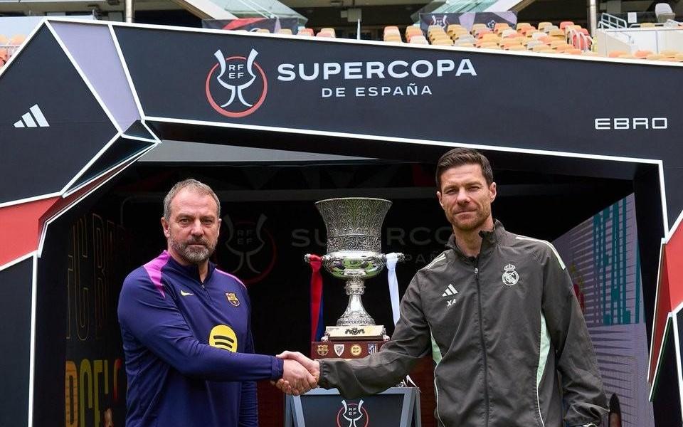 传统环节,西超杯决赛前弗里克和阿隆索在奖杯前合影