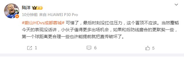 媒体人陆洋表示,蓉城被逆转绝杀太可惜,“可惜了,最后时刻没扛住压力,这个冒顶不应该。当然蹇韬今天的表现没话讲,小伙子值得更多出场机会,如果和后防线磨合的更默契一些,第一个球距离更合理一些也许能提前就把直传破坏了。”