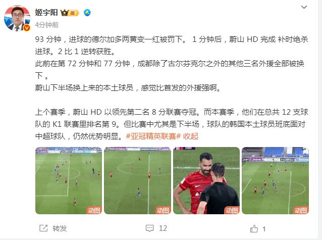 来自上海的媒体人姬宇阳则表示,蔚山的韩国球员面对中超球队优势明显,“蔚山下半场换上来的本土球员,感觉比首发的外援强啊。上个赛季,蔚山 HD 以领先第二名 8 分联赛夺冠。而本赛季,他们在总共 12 支球队的 K1 联赛里排名第 9。但比赛中尤其是下半场,球队的韩国本土球员班底面对中超球队,仍然优势明显。”