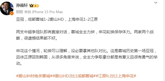 媒体人孙雨轩则表示,蓉城派主力主要是徐正源回到韩国,“两支中超争冠队即将直接对话,蓉城全主力拼,申花轮换保存体力。两家两个战略,很遗憾结果都不好。申花这个情况,轮换可以理解,没必要拿其他队对比。这是蓉城历史第一场亚冠,且徐正源回到韩国,从很多角度来说,全主力争取拿分都是有意义且很有勇气的举动。”